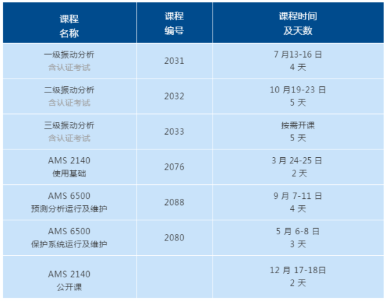 艾默生2020年培训课程含ISO振动分析师认证培训一级、二级、三级;AMS 2140、6500保护及分析产品培训以及其他定制培训